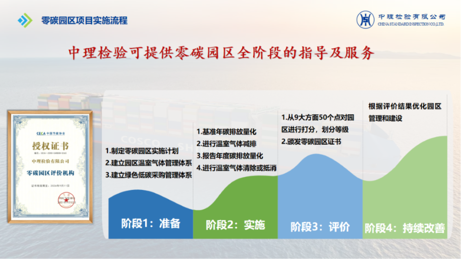 这一资(zi)质的(de)获批(pi)标志(zhi)着中理检验成为(wei)中国首(shou)批(pi)具备零(ling)碳(tan)(tan)园(yuan)区认证(zheng)能力的(de)第(di)三(san)方(fang)机构。公司将为(wei)产(chan)业园(yuan)区提(ti)(ti)供(gong)包括零(ling)碳(tan)(tan)园(yuan)区规划设计(ji)、低碳(tan)(tan)技(ji)术集成应用、碳(tan)(tan)排放核算与监测、绿色(se)运营管(guan)理在内的(de)全链条(tiao)专(zhuan)业服务,为(wei)全国各(ge)类园(yuan)区提(ti)(ti)供(gong)科学、规范、权(quan)威的(de)零(ling)碳(tan)(tan)评价服务。 未来,中理检验(yan)将严格(ge)遵循国家相(xiang)关标准和规(gui)范(fan),依托零(ling)(ling)碳(tan)评价服务专(zhuan)业能力通过物(wu)联网、区块链与数字孪生(sheng)等先进智慧数字化手(shou)段,构(gou)建精细化园(yuan)区碳(tan)管理体系,核算园(yuan)区碳(tan)排放总(zong)量,科学(xue)识别碳(tan)排放的关键环节,为园(yuan)区量身定制切实(shi)可(ke)行的全(quan)流程碳(tan)减(jian)排路径及零(ling)(ling)碳(tan)转(zhuan)型(xing)方(fang)案。